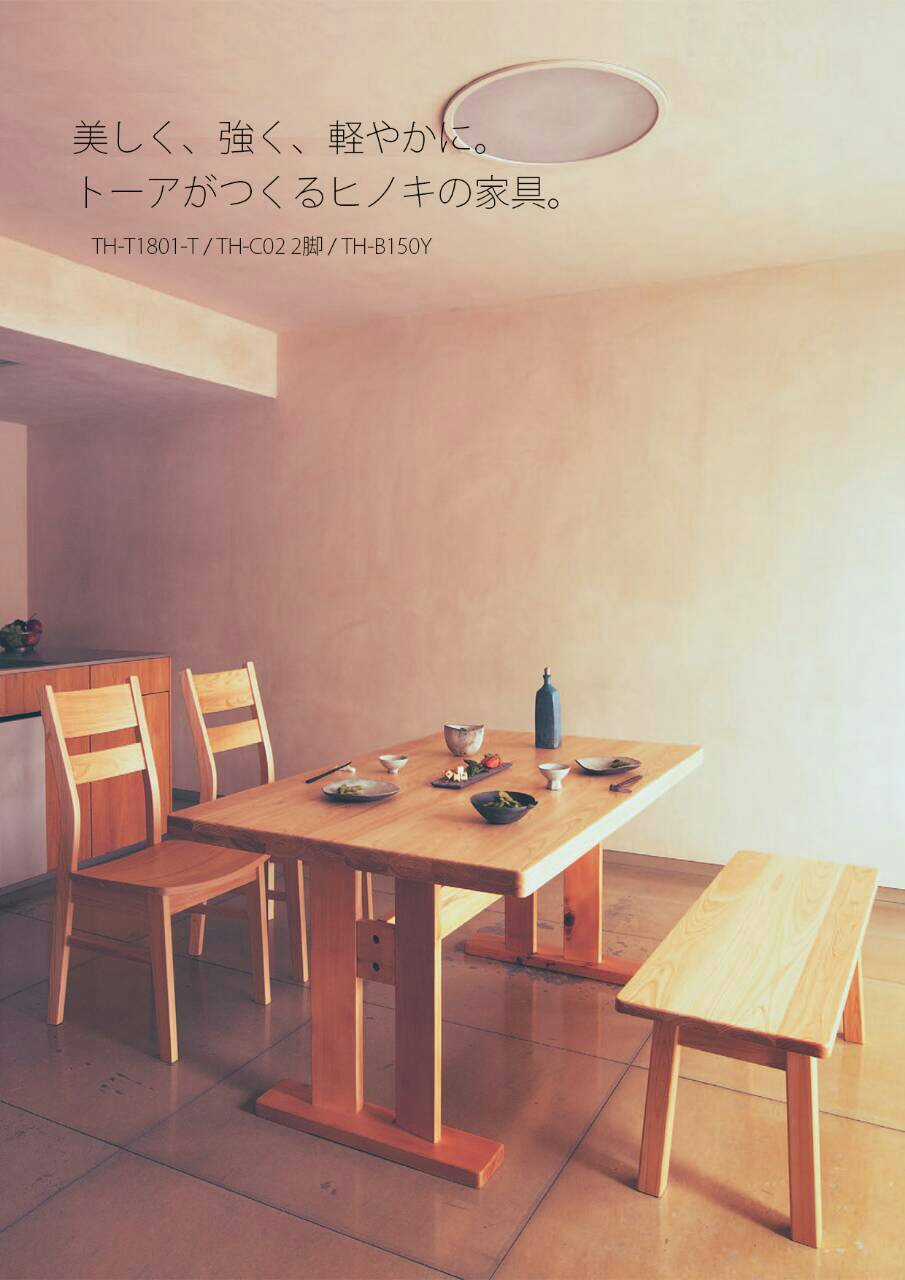 着席、離席が容易なT字脚のテーブルとゆったりとした板座椅子にベンチを合わせたダイニングセット。ヒノキは日本書記の中にも宮殿に使うべき最適な木としてその名が記されています。他の木材に比べて軽量であることも大きな特長です。ヒノキ材と言う魅力ある素材を日々の生活で使っていただきたい。