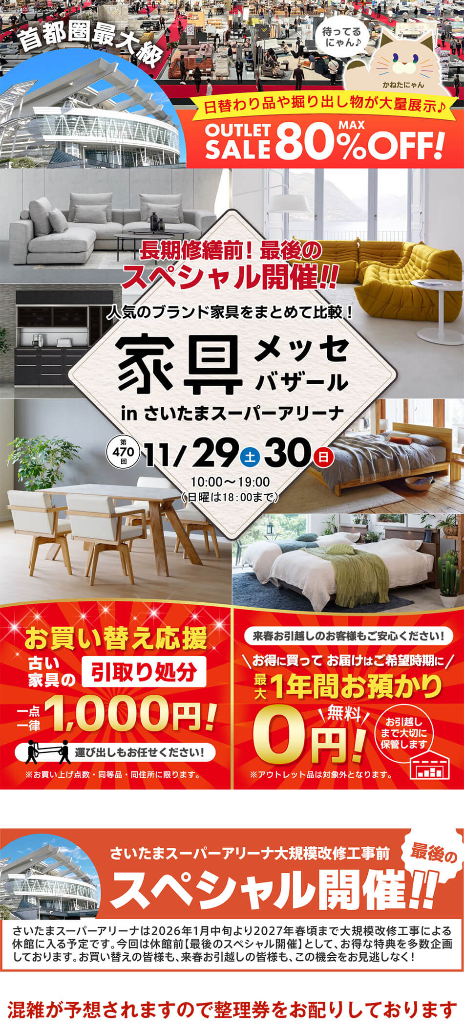 株式会社かねたや家具店 ※イベントに関するお問合せは、メールにてお願い致します。 家具メッセバザール in さいたまスーパーアリーナ事務局 event_messe@roomdeco.co.jp |