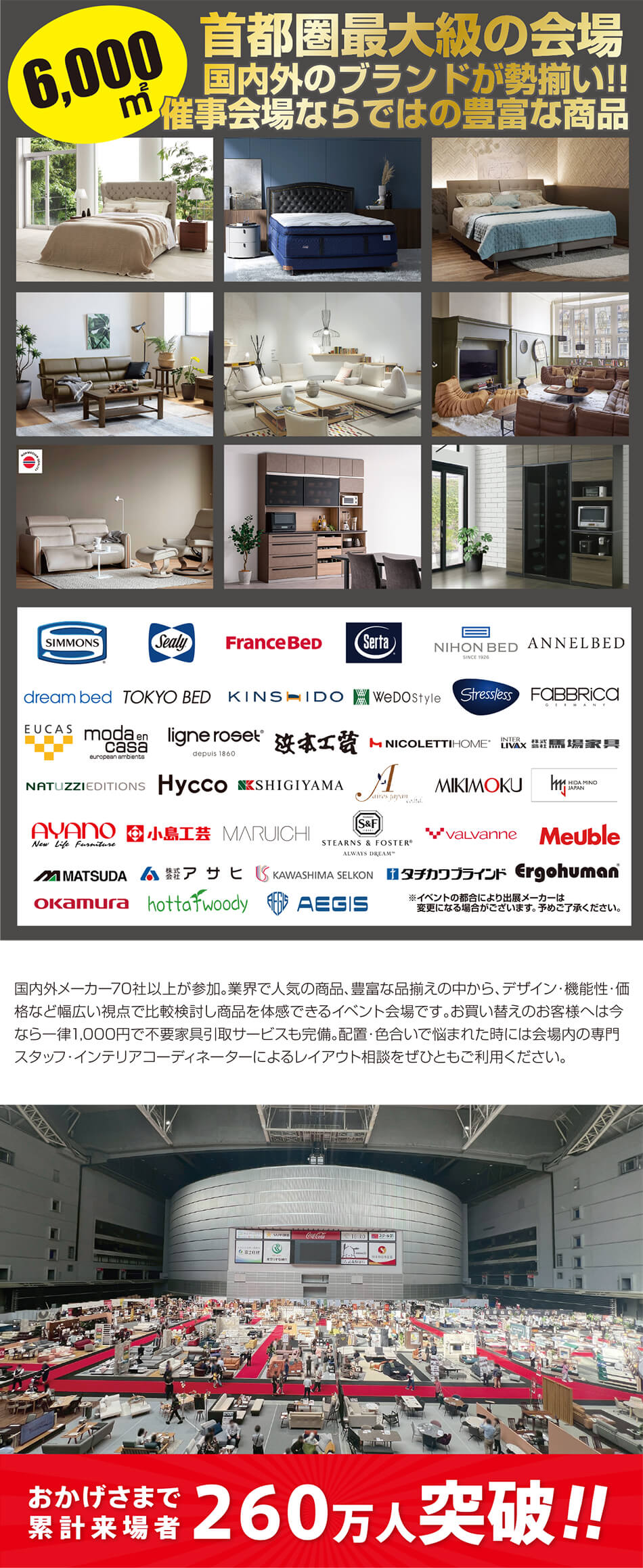 シモンズ シーリー 東京ベッド MARUICHI サータ モーダ・エン・カーサ Stressless フランスベッド ウィドゥ・スタイル ニコレッティ・ホーム Natuzzi Editions リーン・ロゼ 冨士ファニチア MATSUDA 小島工芸 AYANO 日本ベッド 浜本工芸 プレーベル ※イベントの都合により出展メーカーは変更になる場合がございます。 |