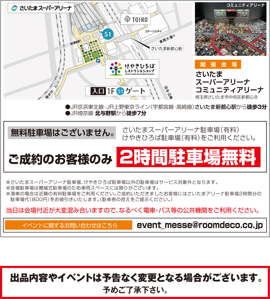 さいたまスーパーアリーナ駐車場(有料)、けやきひろば駐車場(有料)をご利用ください。 ご成約のお客様に2時間無料無料駐車券をお渡しいたします。 ※会場駐車場は機械式駐車場のため車両スペースには限りがございます。 ※満車の場合は近隣の有料駐車場をご利用ください。ご成約いただきましたお客様には2時間分の駐車場代(800円)をお値引きいたします。駐車券の控えをご提示ください。 当日は会場付近が大変混み合いますので、なるべく電車・バス等の公共機関をご利用ください。 |