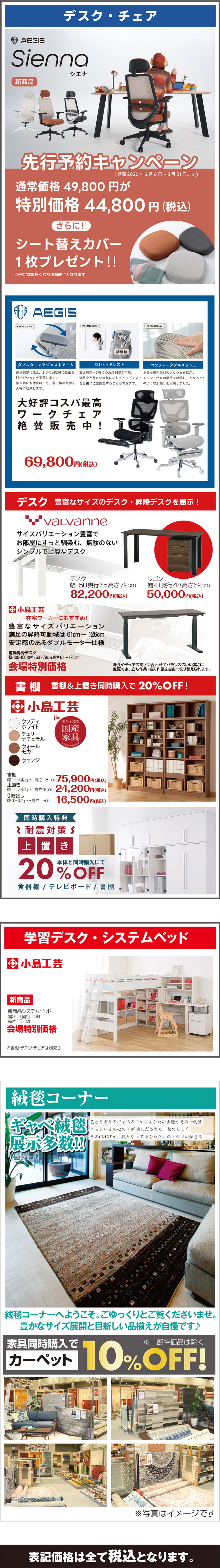 ※ダイニングセット(テーブル+イス)、ベッド(フレーム+マット)は1セットとします。※アウトレット商品は対象外となります。※他の割引サービスと併用できません。詳しくは会場スタッフにお尋ねください。