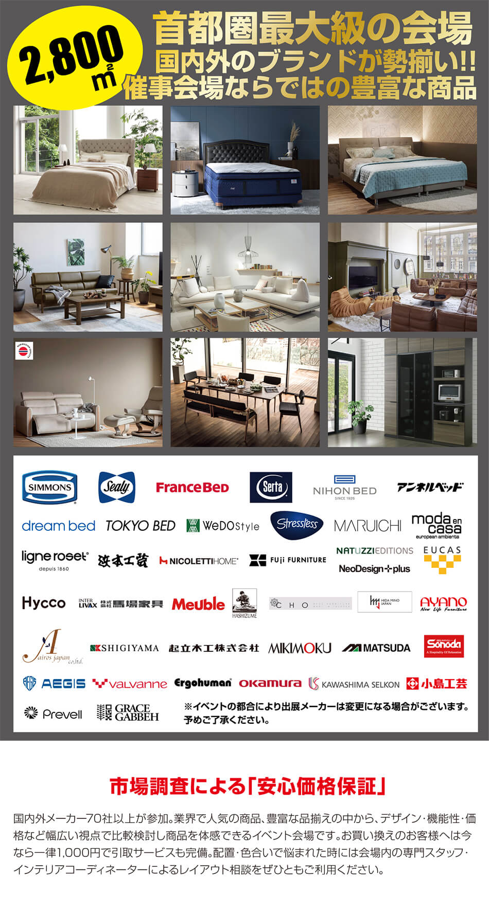 シモンズ シーリー 東京ベッド MARUICHI サータ モーダ・エン・カーサ Stressless フランスベッド ウィドゥ・スタイル ニコレッティ・ホーム Natuzzi Editions リーン・ロゼ 冨士ファニチア MATSUDA 小島工芸 AYANO 日本ベッド 浜本工芸 プレーベル ※イベントの都合により出展メーカーは変更になる場合がございます。 |